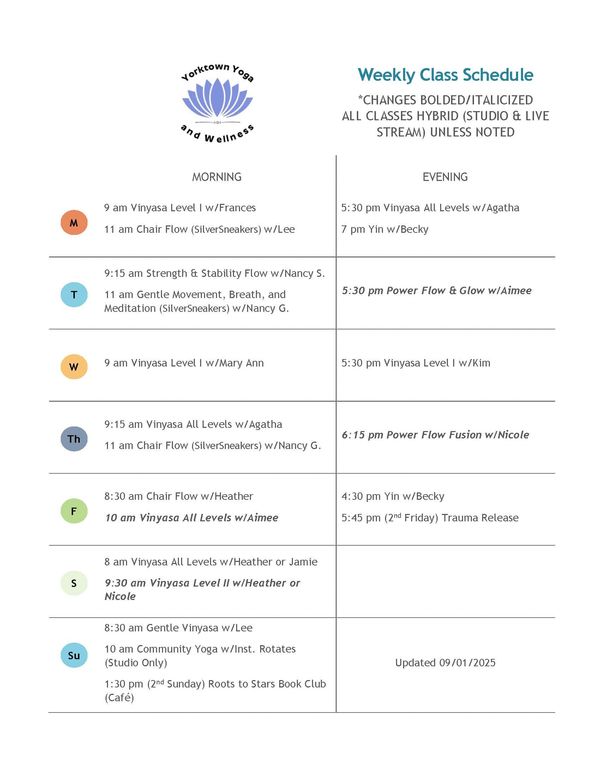 Clink the Classes link below for our current schedule of yoga and wellness classes including special hours, cancelations, or closures.